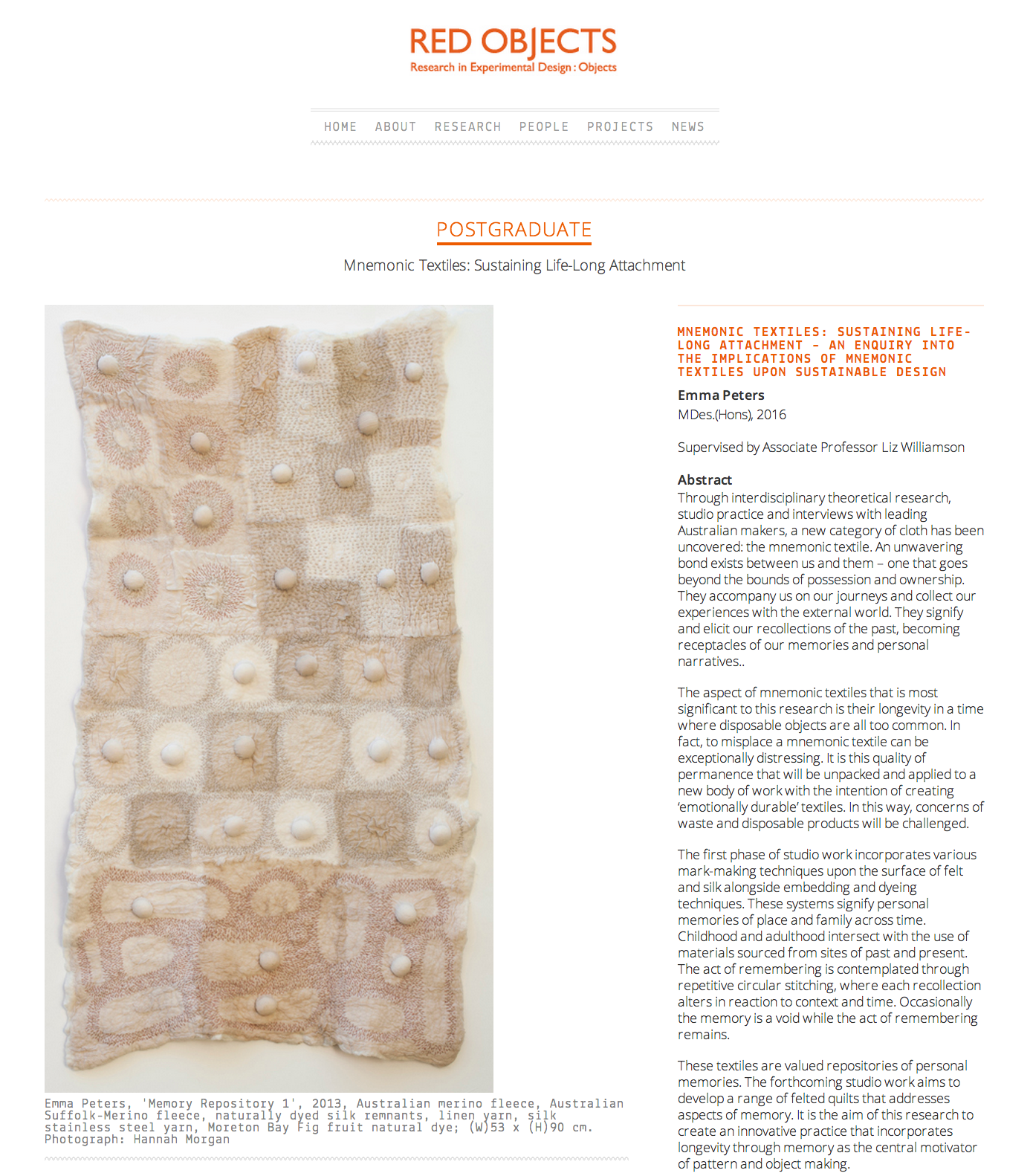 It is a pleasure to be profiled on the esteemed RED Objects site. You can read more about my current research into textiles, memory and sustainability here.